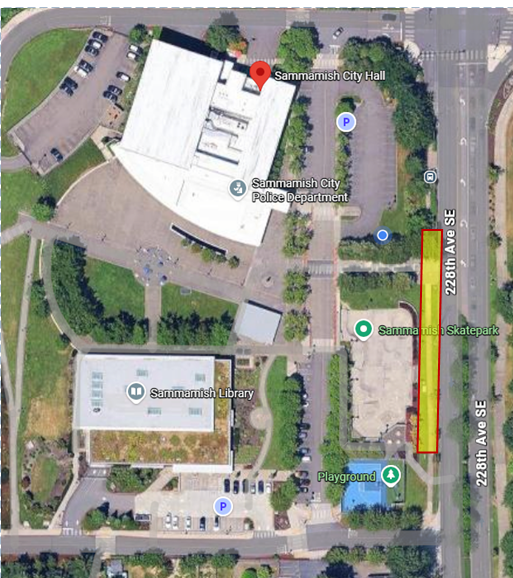 The location for this installation will be in front of the Sammamish Upper Commons, located at 801 228th Ave SE, Sammamish, WA 98075. The highlighted area in the below image shows the boundaries of where the sculpture can be placed. This area is open to the public, and artists are welcome to visit the site. We are open to possibilities within this area, including art affixed to the light poles, attached to the fencing, in the trees, on the skatepark wall, etc.