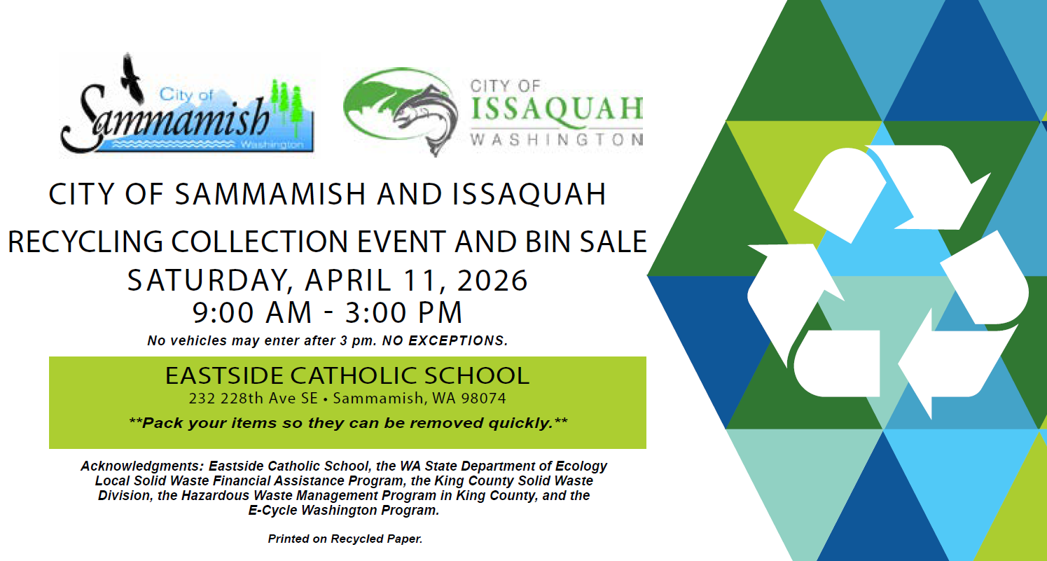 Come celebrate Earth month by properly disposing of your hard-to-recycle items! This is a joint event between the City of Sammamish and the City of Issaquah, hosted by Eastside Catholic School.