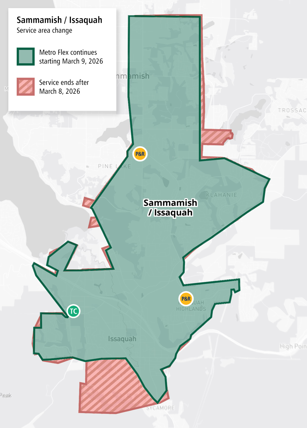 Service Area UpdateStarting Monday, March 9, 2026 the Sammamish / Issaquah service area is being adjusted. Metro Flex service will expand to the Issaquah Highlands and remove service from the Squak neighborhood. |
