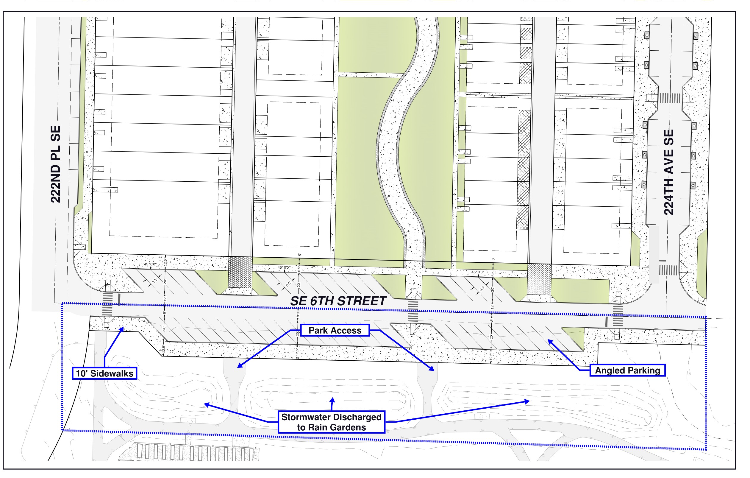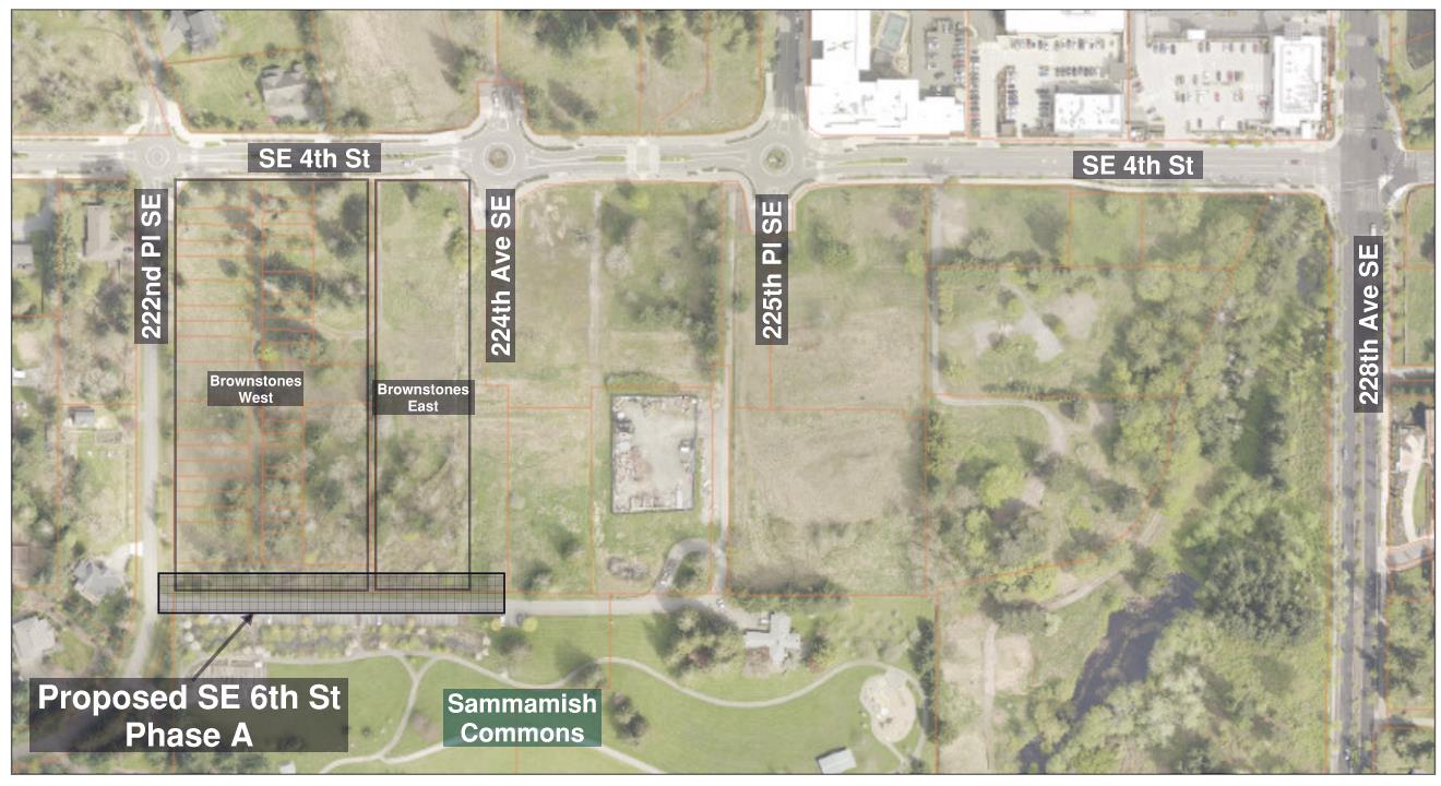 The SE 6th Street Improvements - Phase A Project will consist of the construction of a new public street that will run along the north end of Sammamish Commons Park, between 222nd Place SE and 224th Avenue SE. The SE 6th Street Improvements Project, which is part of the City’s transportation and stormwater capital improvement plans, will upgrade an existing road and add sidewalk, community parking, trees, lighting, and new stormwater infrastructure. The project also plans to the retain existing rain gardens, reduce impervious surface, and create a connection for the community to the Lower Sammamish Commons Park.